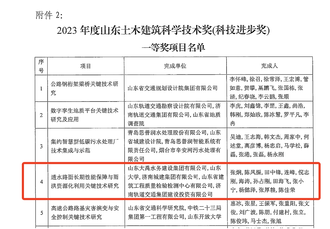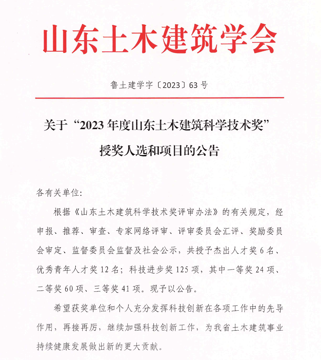 近日,山東土木建筑學(xué)會(huì)公布了“2023年度山東土木建筑科學(xué)技術(shù)獎(jiǎng)(科技進(jìn)步獎(jiǎng))獲獎(jiǎng)名單”并頒發(fā)榮譽(yù)證書。由山東大禹水務(wù)建設(shè)集團(tuán)有限公司等單位共同申報(bào)的“透水路面長(zhǎng)期性能保障與雨洪資源化利用關(guān)鍵技術(shù)研究”項(xiàng)目榮獲“2023年度山東土木建筑科學(xué)技術(shù)獎(jiǎng)”一等獎(jiǎng)。