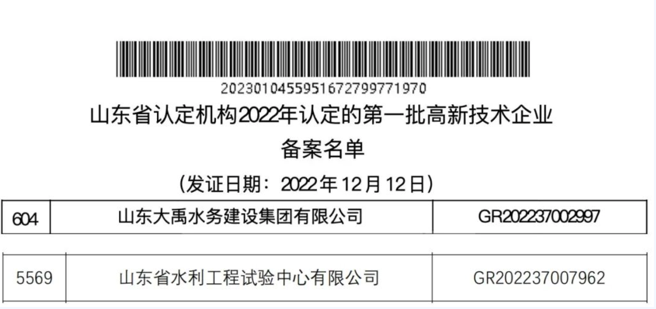 2023年12月28日,全國高新技術企業認定管理工作領導小組辦公室公告了山東省2023年認定報備的第二批高新技術企業名單,山東省水利勘測設計院有限公司(以下簡稱公司總部)和權屬企業山東省水利工程建設監理有限公司(以下簡稱監理公司)位列其中。公司總部是第三次通過國家高新技術企業認定,監理公司則是首次通過認定,這標志著公司總部和權屬一級企業全部通過國家高新技術企業認定。作為山東水設權屬企業的山東大禹水務建設集團有限公司、山東省水利工程試驗中心有限公司均于2022年首次通過國家高新技術企業認定。