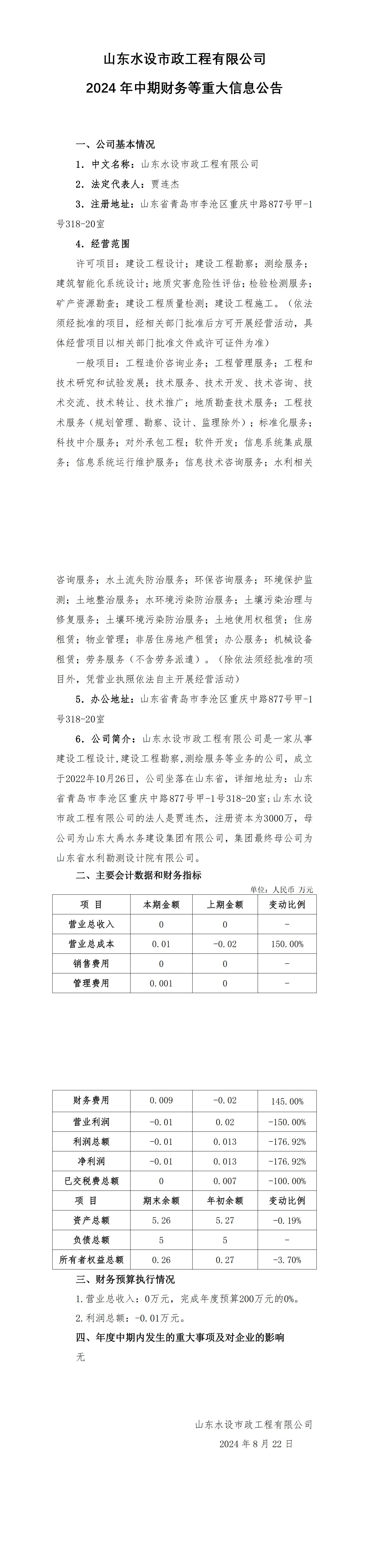 山東水設市政工程有限公司2024年中期財務等重大信息公告