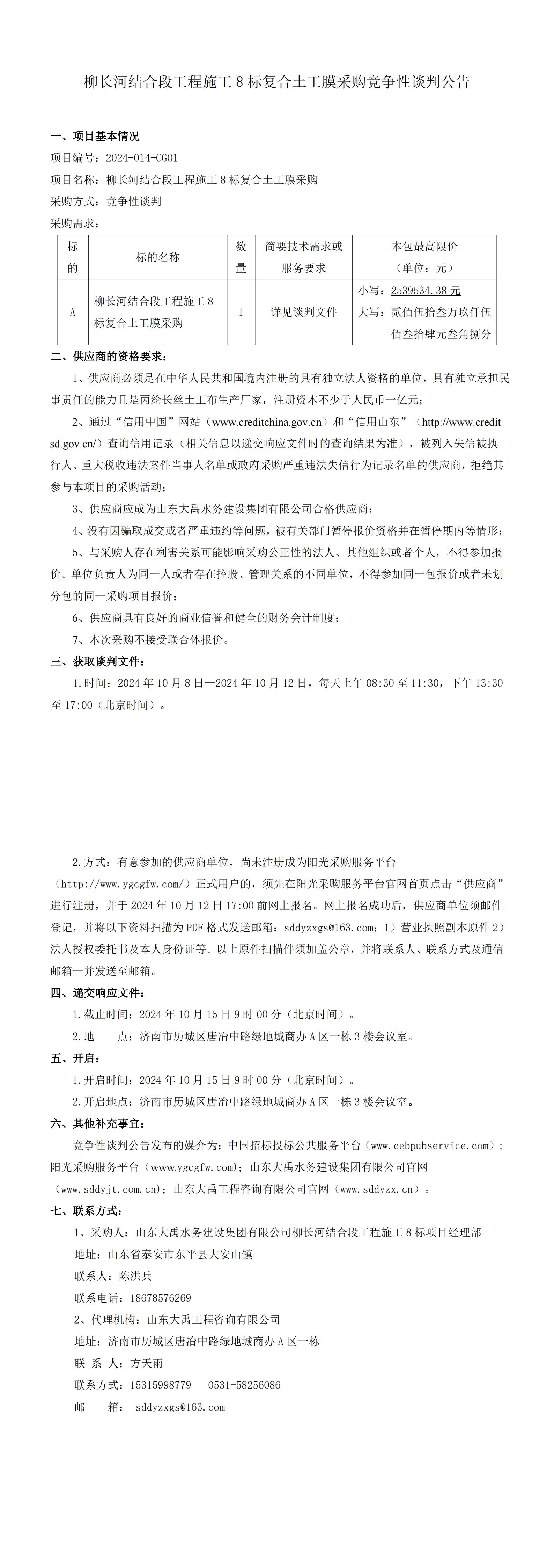 柳長(zhǎng)河結(jié)合段工程施工 8 標(biāo)復(fù)合土工膜采購(gòu)競(jìng)爭(zhēng)性談判公告
