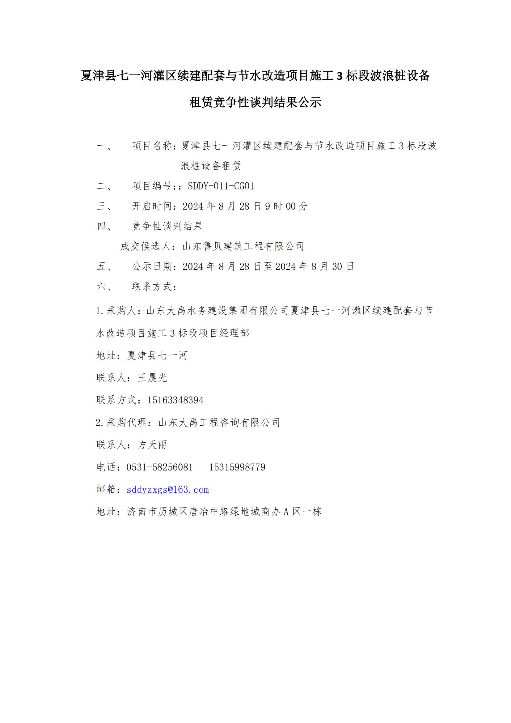 夏津縣七一河灌區(qū)續(xù)建配套與節(jié)水改造項(xiàng)目施工 3 標(biāo)段波浪樁設(shè)備 租賃競爭性談判成交結(jié)果公示