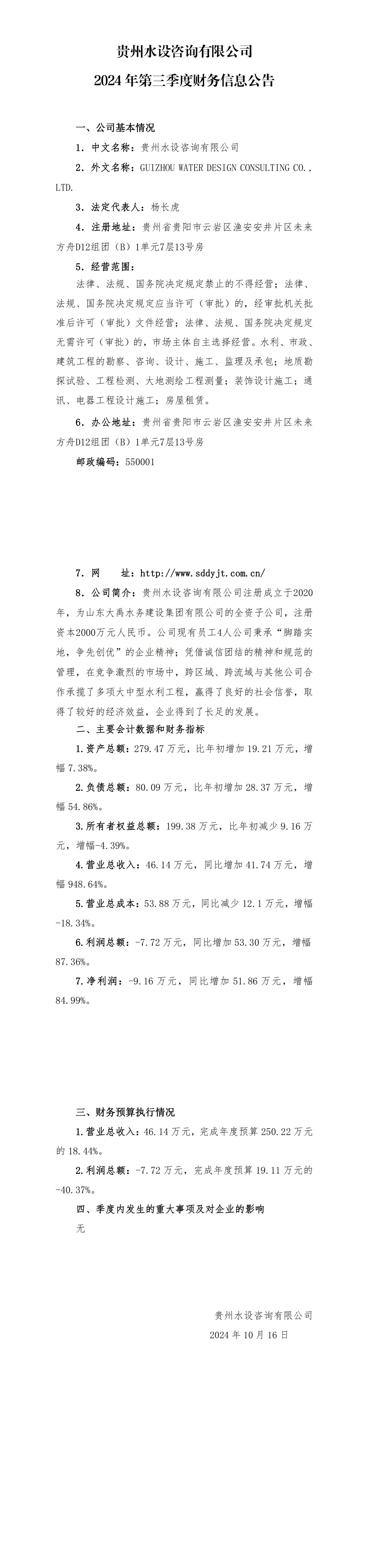 貴州水設咨詢有限公司2024年第三季度財務信息公告