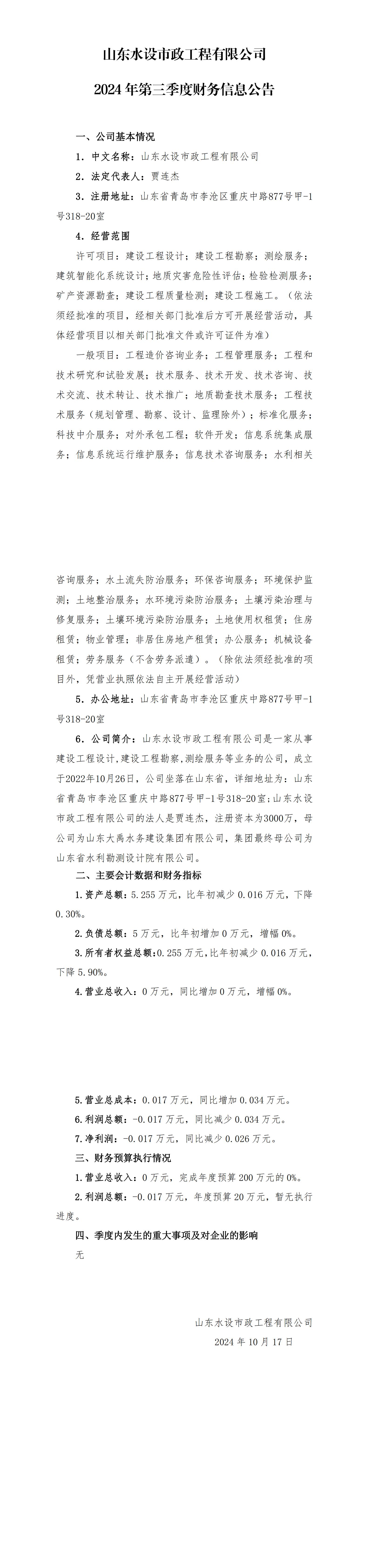 山東水設市政工程有限公司2024年第三季度財務信息公告